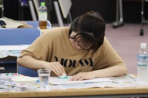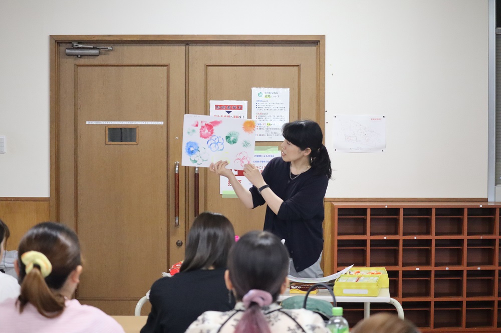 今回の授業では、スタンピングで様々な図形に触れる遊びを行いました。最初に時間をかけて、構成を考えていた人や気持ちの赴くままスタンピングしていた人等、個性豊かな作品が出来上がりました。保育者となる学生のみなさんには、子どもたちが数量、図形に興味や関心をもち、体験していくことの意味を理解し、援助ができるようになってほしいと思います。