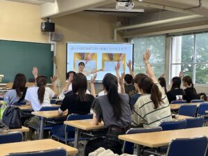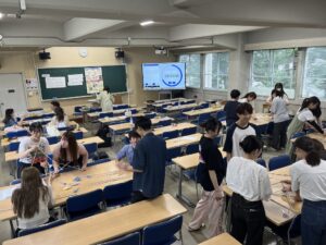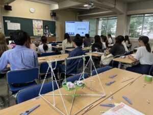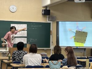 本日の授業では、ICTを活用したデジタル教材の紹介と、これまで各班が実施してきた模擬授業の様子(写真)も振り返りながら課題や改善点について考えました。当講義では学生の皆さんが模擬授業に積極的に参加し、楽しみながら取り組んでいたのが印象的でした。一連の実践を通して、図画工作科の授業の具体的なイメージが掴めるようになったようです。