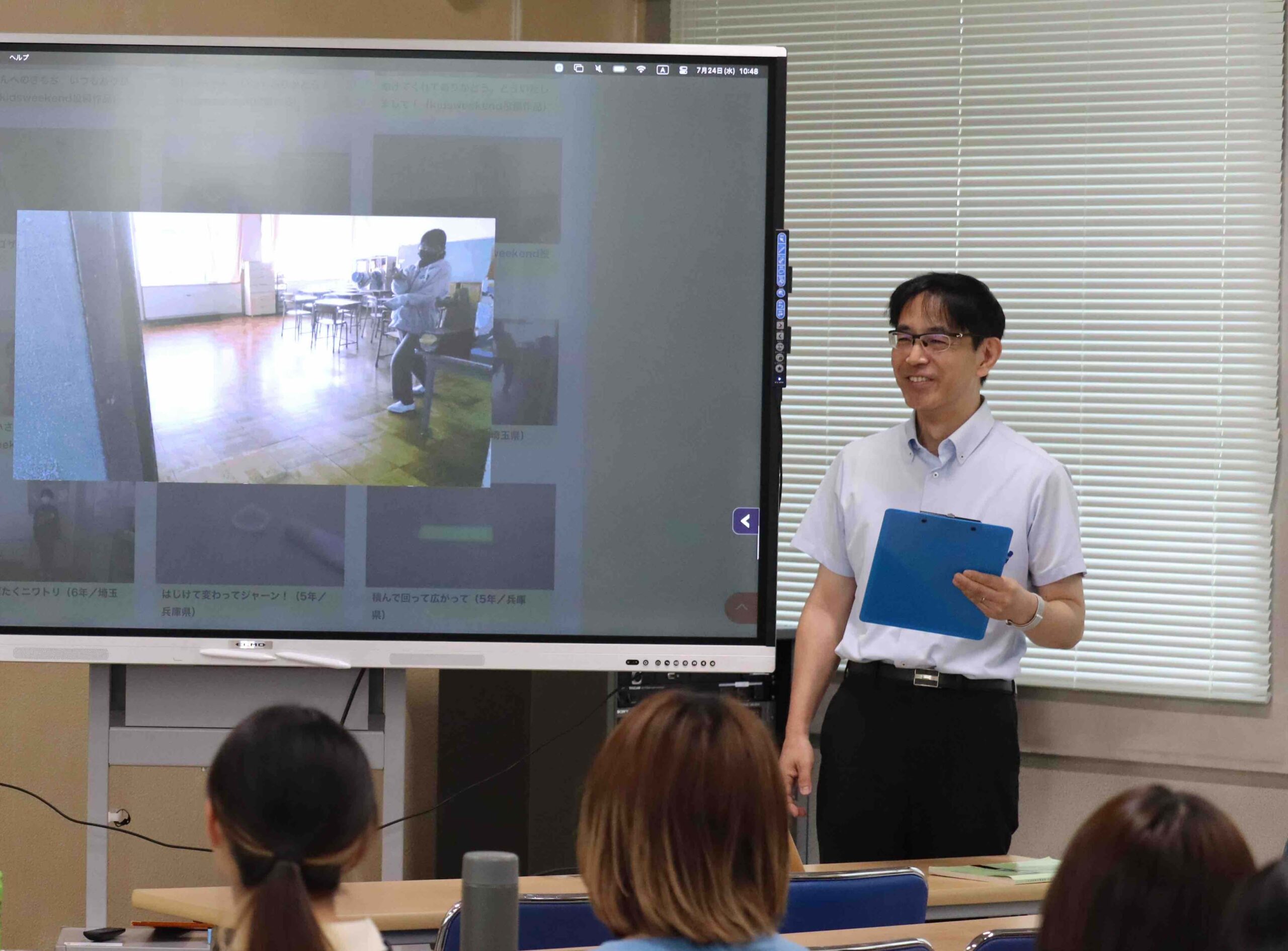 本日の授業では、ICTを活用したデジタル教材の紹介と、これまで各班が実施してきた模擬授業の様子(写真)も振り返りながら課題や改善点について考えました。当講義では学生の皆さんが模擬授業に積極的に参加し、楽しみながら取り組んでいたのが印象的でした。一連の実践を通して、図画工作科の授業の具体的なイメージが掴めるようになったようです。